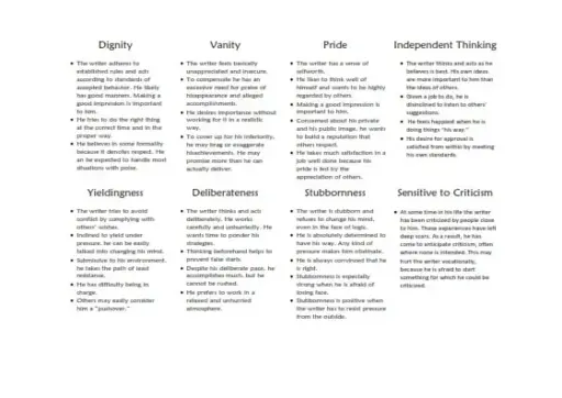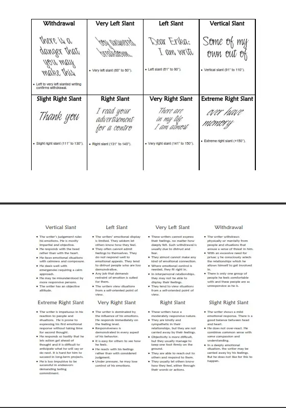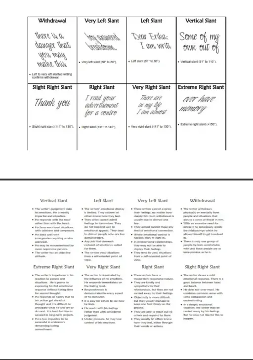 These flash cards describe and illustrate 112 personality traits. They are great because they make writing an analysis faster and easier. They fit in a briefcase or pocketbook, so you can take them with you can take them with you and be the life of a party. And when you are doing an analysis in your office, just whip out the cards and in no time you will have identified all of the traits in your handwriting sample. These flash cards are NOT something you are going to zip through once, put on a shelf and never go back to. They are a true tool kit you will keep going back to, time after time. And each time, you will strengthen your memory and eventually you will be able to spot the traits without using the cards. The flash cards are ready for printing on heavy card stock. They can be easily cut into individual cards. The description will be on one side and the illustration on the other