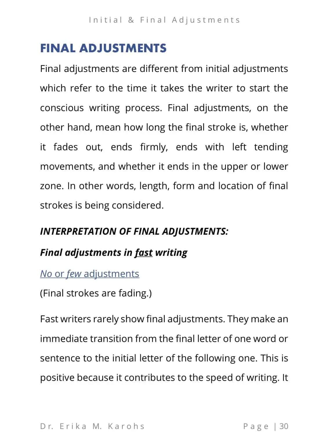 Initial and Final Adjustments is an inner circle e-book series written by Dr. Erika M. Karohs, Ph. D., Ed. D. which explains the importance of interpreting initial and final adjustments in writing in terms of form, position, pressure, and speed.