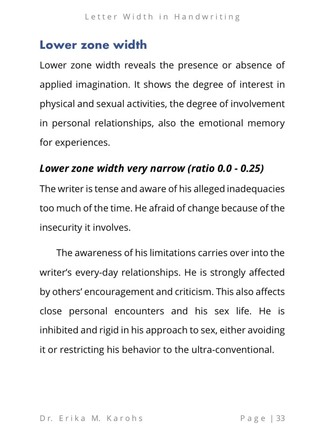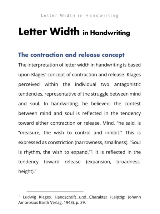 Letter Width in Handwriting is an e-book written by Dr. Erika M. Karohs. This e-book explains the meaning of various letter widths in handwriting and their interpretation in each writing zone.