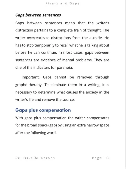 Rivers and Gaps in Word Spacing is an e-book written by Dr. Erika M. Karohs. This e-book explains that word spacing in writing refers to the writer’s attitude in everyday social relationships. They symbolize the closeness or distance they maintain, the desire to work alone or in groups, and the level of involvement or isolation. The distance between words that form a “river” in a paragraph has its own meaning.