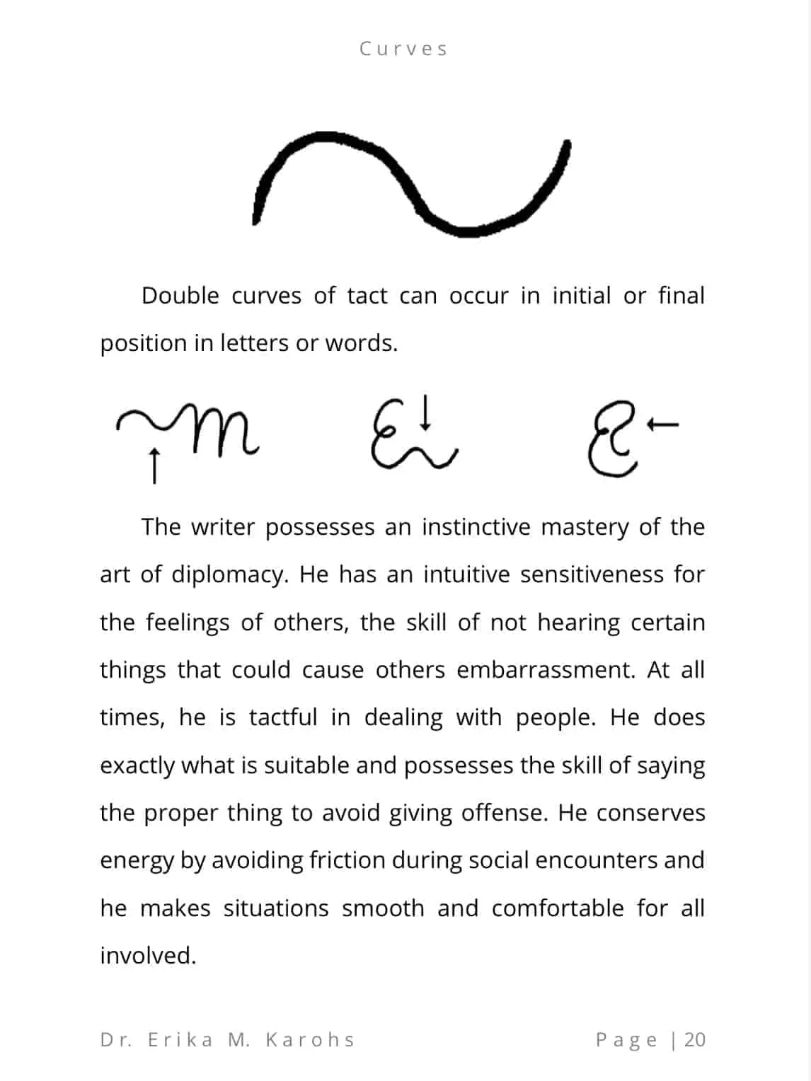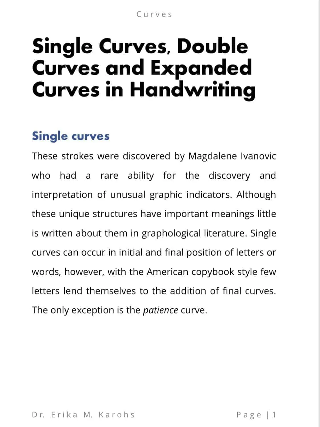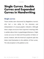 Single Curves, Double Curves and Expanded Curves is an e-book written by Dr. Erika M. Karohs. This e-book contains curves in handwriting which are divided into three, namely single curves, double curves and broad curves. Each of these three types has its own interpretation of graphic indicators and meanings.