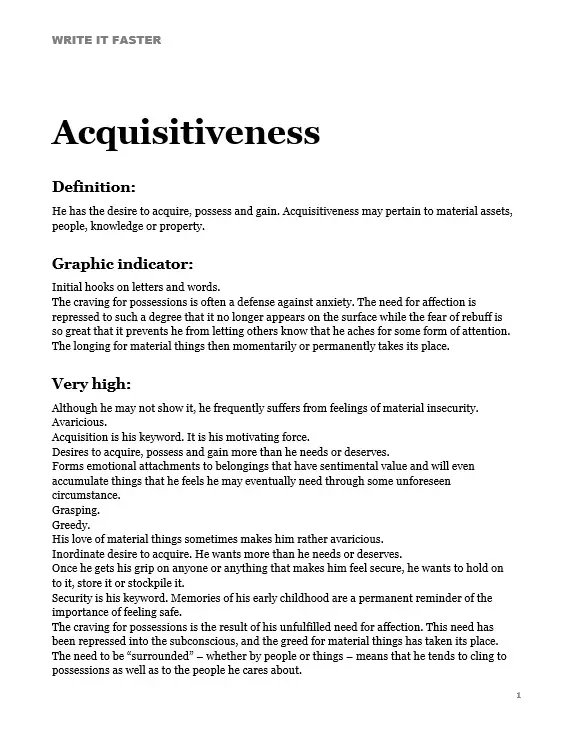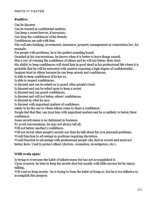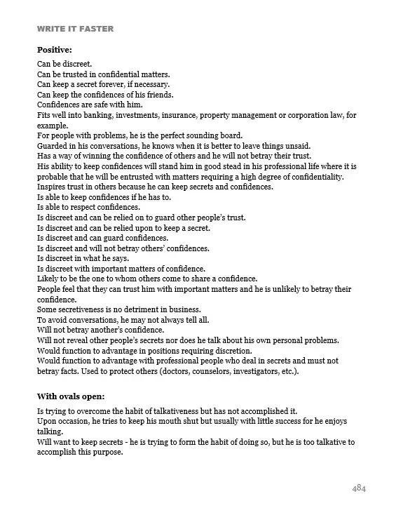 This book is PURE GOLD. With nearly 800 pages, Write It Faster is the most comprehensive book of trait descriptions available today. You can simply copy and paste the phrases into your analysis. Trait descriptions in “Write It Faster” are so plentiful that you will not run out of things to say, no matter how many analyses you write.